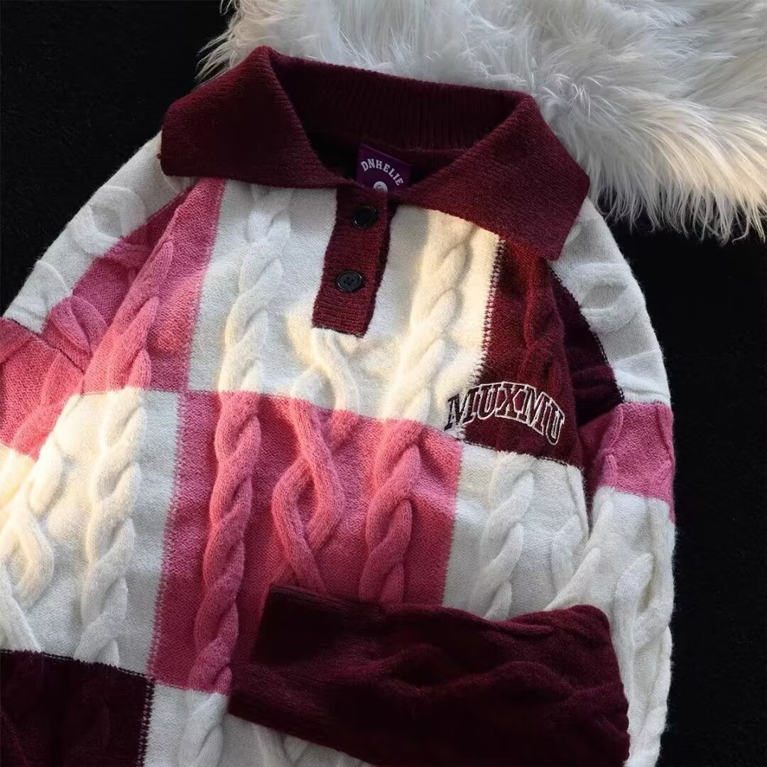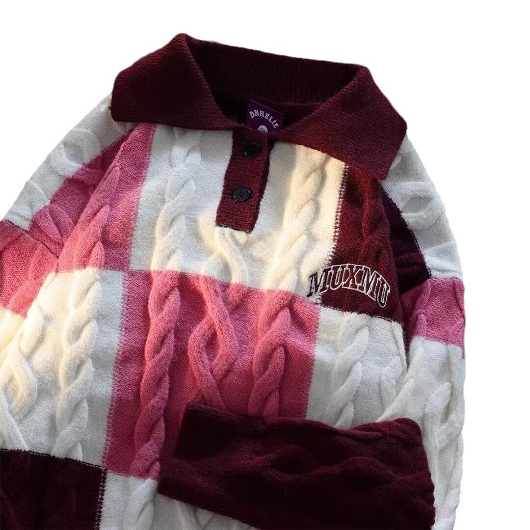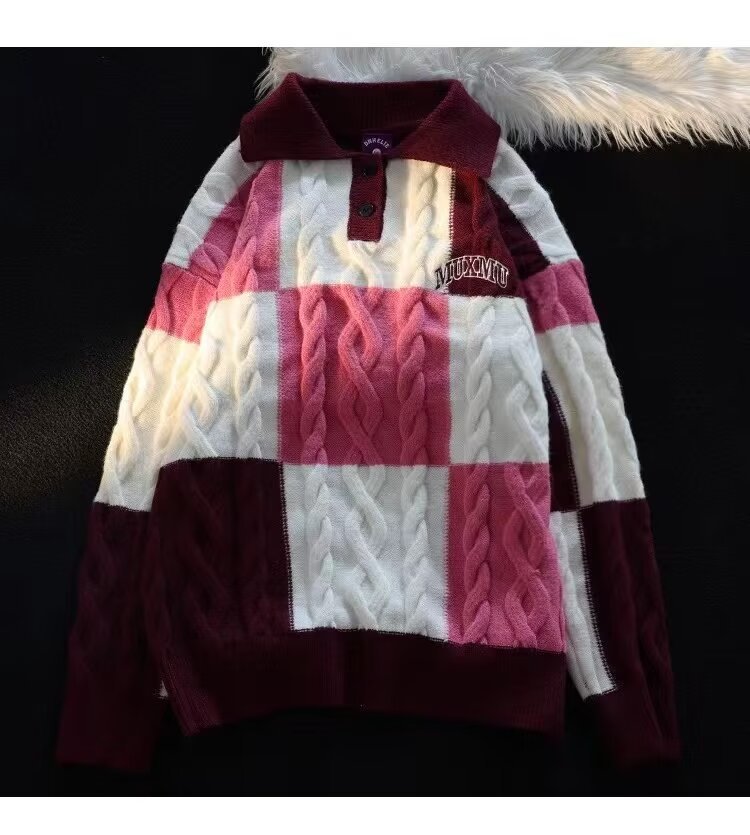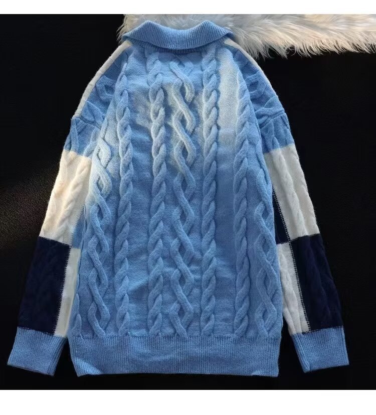 Women’s Contrast-Color Cable-Knit Sweater with Turn-Down Collar – Casual Knitwear